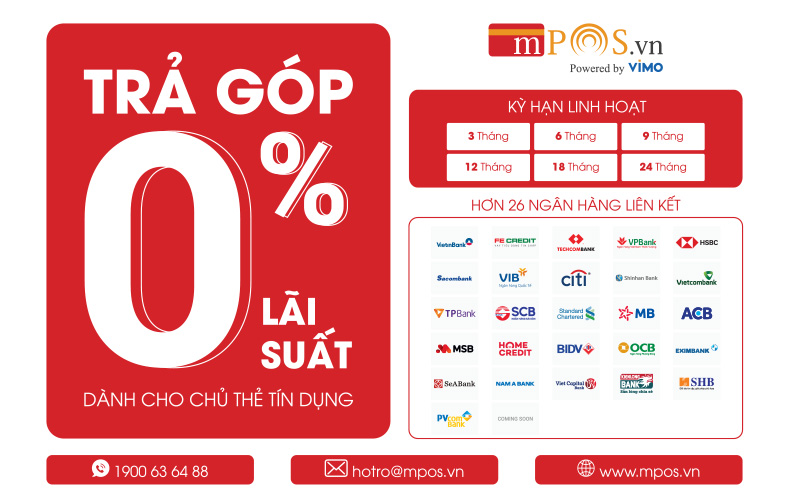 - Giải pháp trả góp 0% lãi suất: mPOS hợp tác với hơn 26 ngân hàng phát hành thẻ tín dụng lớn nhất Việt Nam, cho phép chủ thẻ mua sắm trả góp 0% lãi suất tại các cửa hàng sử dụng giải pháp thanh toán mPOS.
