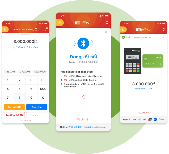Để sử dụng thiết bị đọc thẻ mPOS (PR-02), bạn cần thực hiện các bước sau: Nhập số tiền vào ứng dụng và chọn “Quẹt thẻ”. Mở thiết bị đọc thẻ và kết nối với điện thoại qua Bluetooth.