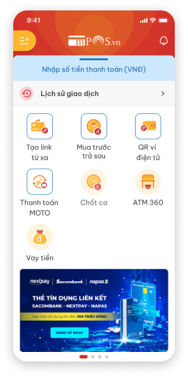 Hãy vuốt lên để khám phá thêm các tính năng và dịch vụ hữu ích, bạn sẽ thấy các lựa chọn như: Lịch sử giao dịch, Tạo link thanh toán từ xa, Thanh toán Moto, ATM360, Chốt Ca, banner các chương trình sự kiện và link Hướng dẫn sử dụng ứng dụng.